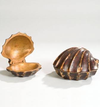 Hand finished wood with an antique gold interior. Left. 8W x 8D x 5H
